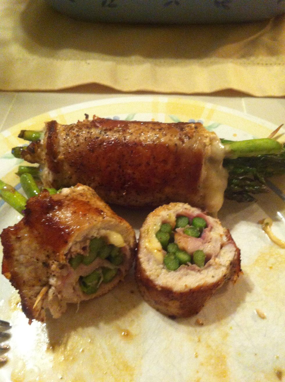 Lay flat from the bottom up, pork cutlet, cheese, prosciutto, fresh asparagus