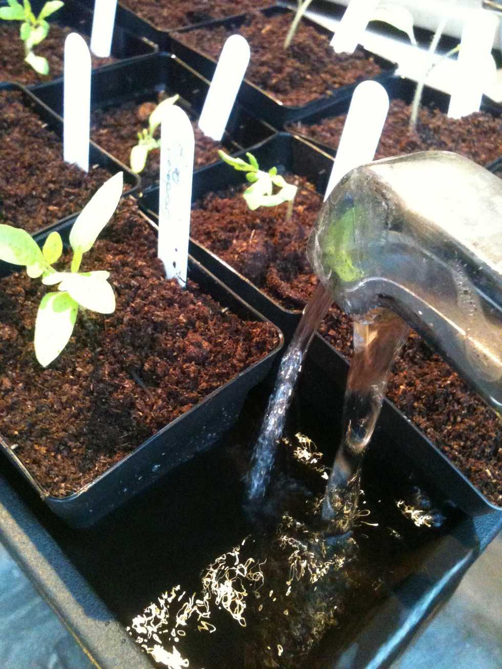 Put the newly planted seedlings into a tray, and fill with water to allow the compost to absorb the moisture.