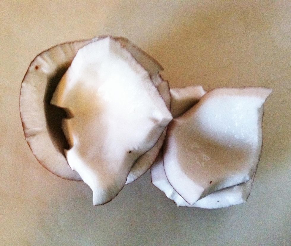 Place the coconut in a plastic bag and, very carefully with a hammer, whack it like a piƱata. Whack away from your face or body and watch out for the backswing!! Or drop onto a hard surface.