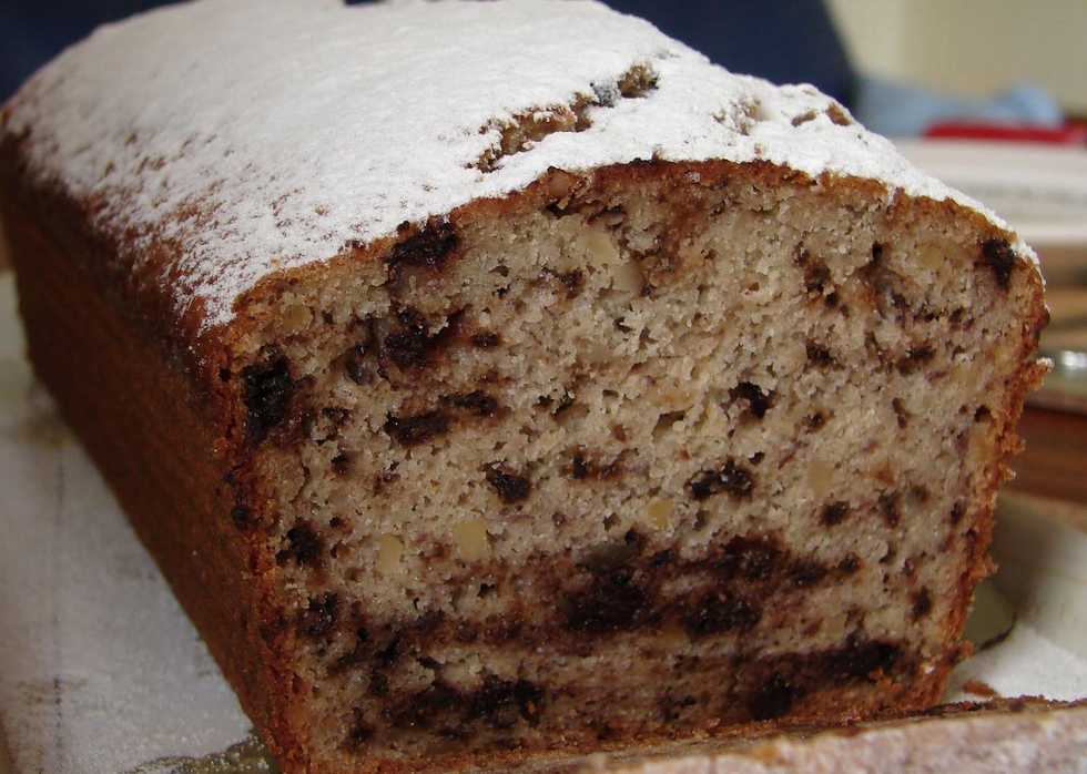 Put bananas, egg and oil in a bowl and use a mixer.Add flour and sugar keep mixingAdd chocolate broken into pieces. And then put in the moldPut in the oven for around 30'.