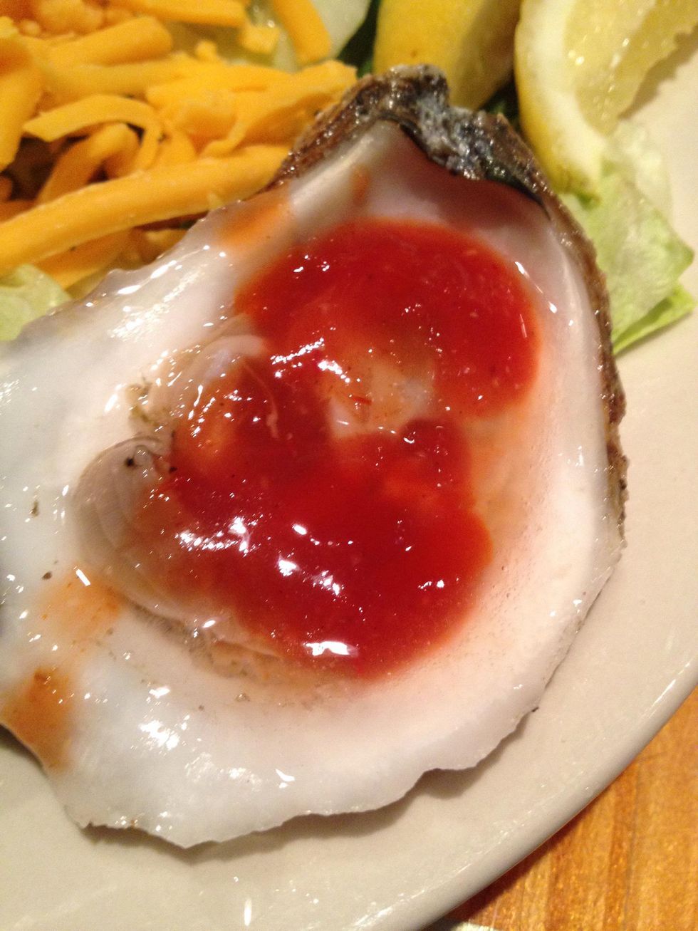 Take your fork or spoon and loosen the muscle.Sprinkle with salt.Add cocktail sauce.A few drops of your favorite hot sauce.Squirt with lemon juice. (I use all of the juice from the wedge)Enjoy.