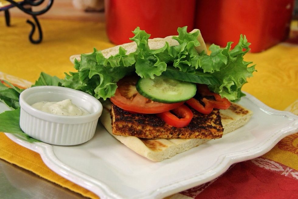 Here we’ve turned it into a delicious sandwich by layering the tofu on pita bread with lettuce, tomato, cucumbers and tzatziki sauce.