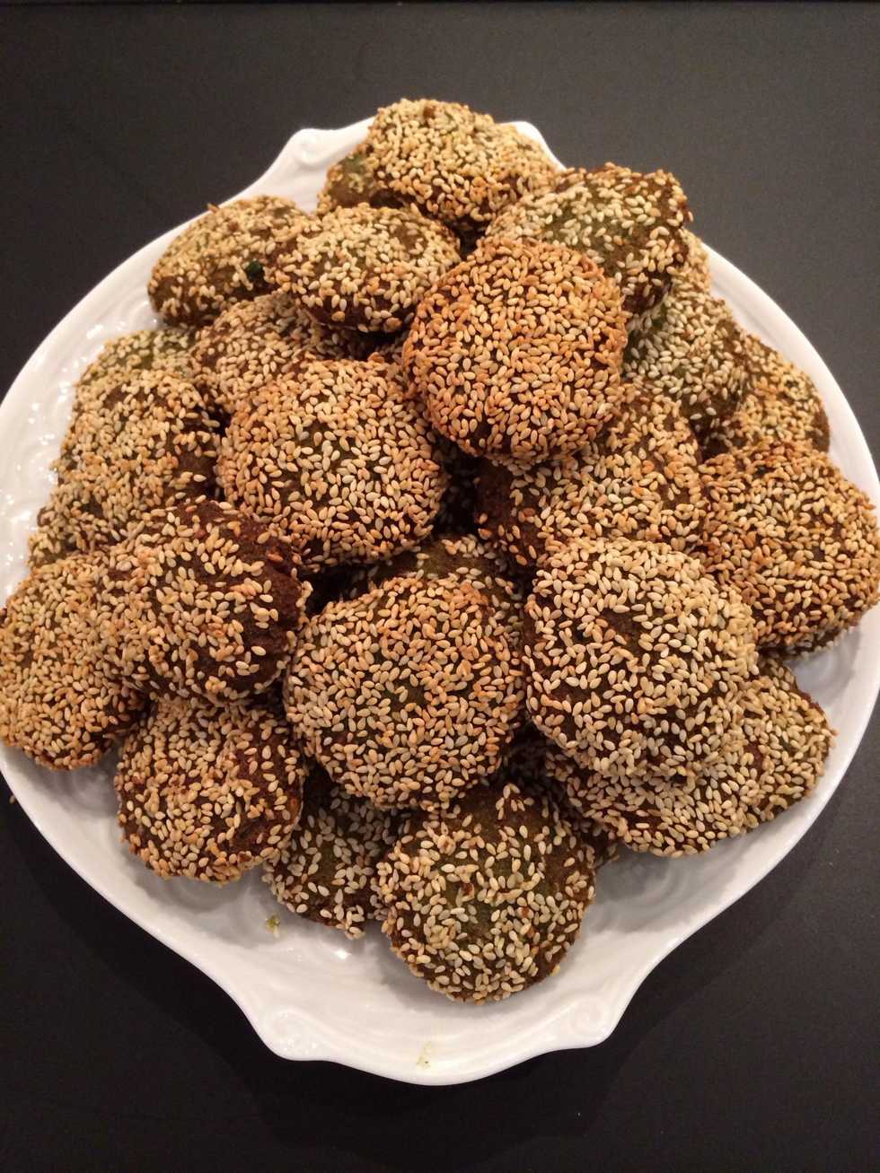 Form the traditional small flat round hamburgers. ; I do it by hand. There is a special utensil to do that... But I don't have it. Deep fry them in very hot oil. Out and on kitchen paper.