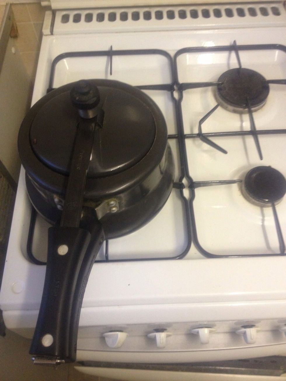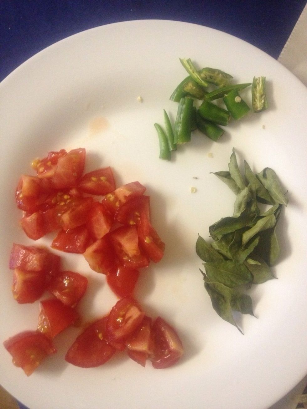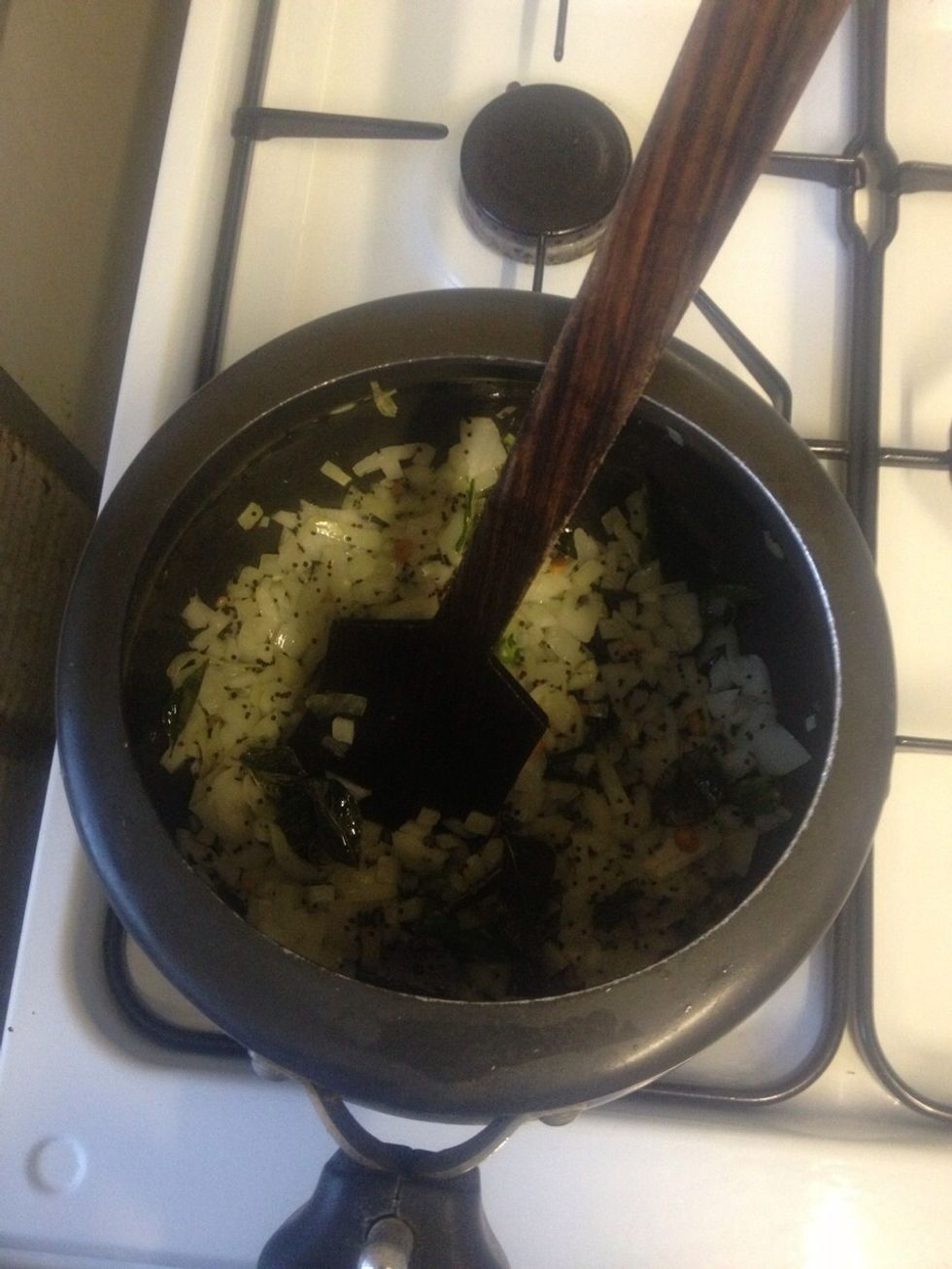 Pre heat a pressure cooker for a 2 mins and add 50ml of sunflower or vegetable oil. Once the oil is boiling, add spices, then diced chillies, then curry leaves, the onions and stir slowly for 8mins