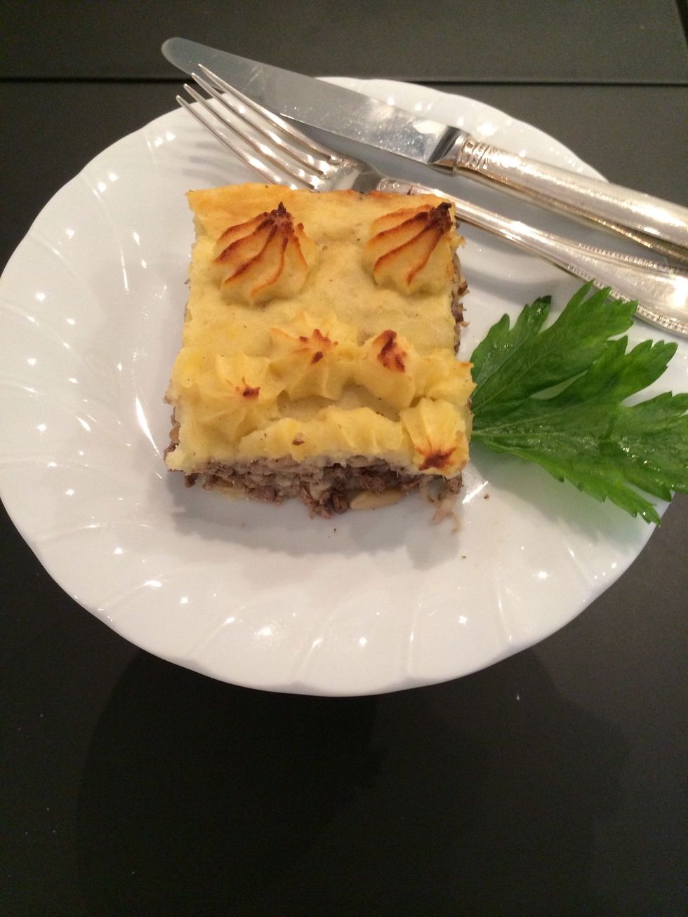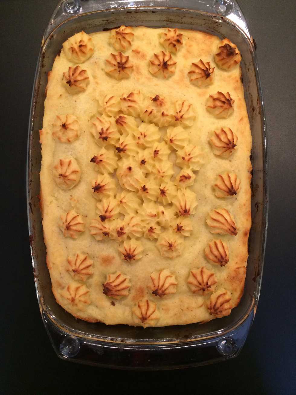 Decorate the dish with the rest of the potatoes. Bake at 190-200C until golden 35 mins