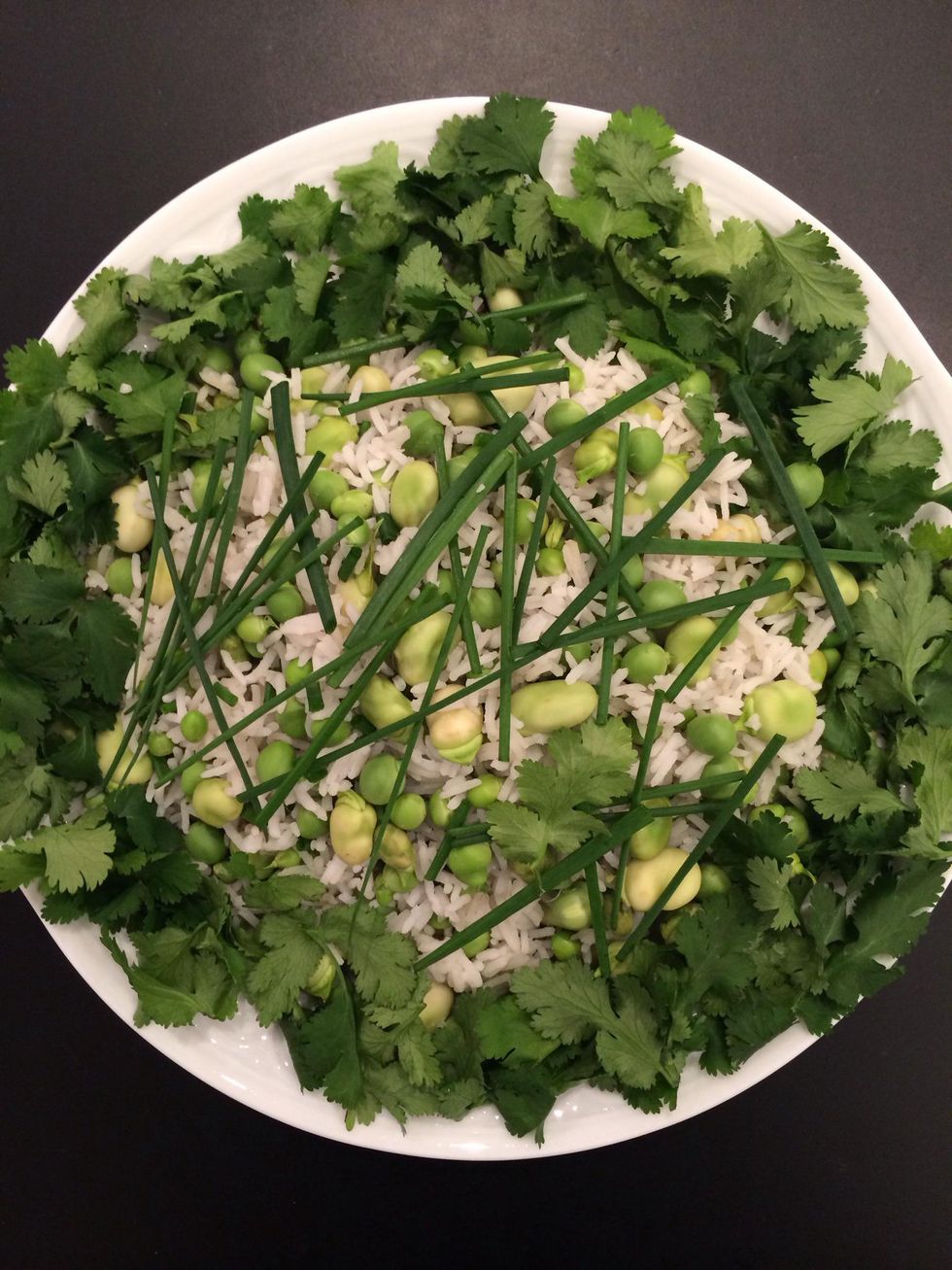 Mix rice with beans add the chives and coriander. Personally I like it without any dressing. I like the taste of raw fresh green new season beans... OR...a drizzle of garlic flavored oil.