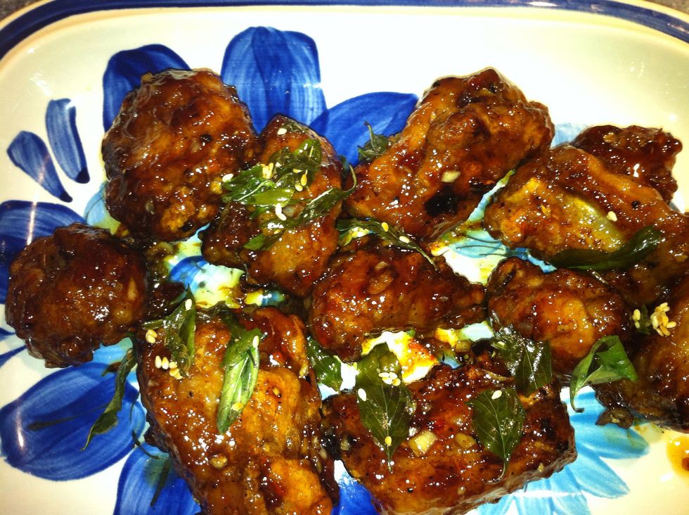Heat some oil and fry basil leaves till crispy. BE CAREFUL - this will spit. Remove and keep aside for garnish.