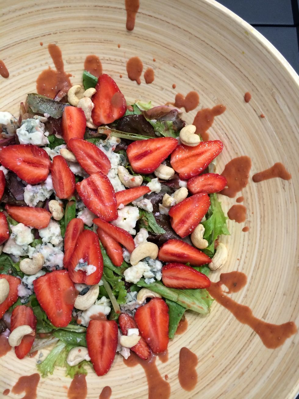Prepare the dressing: balsamic 2TBsp olive oil 4 TBsp 1/2 Tsp mustard, salt and pepper. (Little salt is recommended. The cheese is salty.) also the 6 strawberries and blend