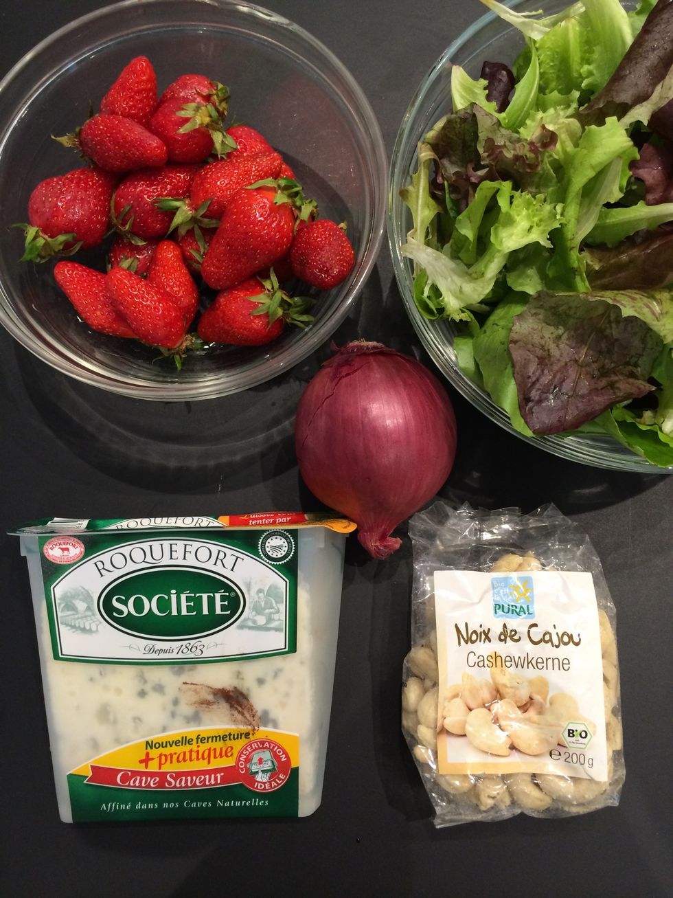 Then put the cheese, the strawberries and the nuts