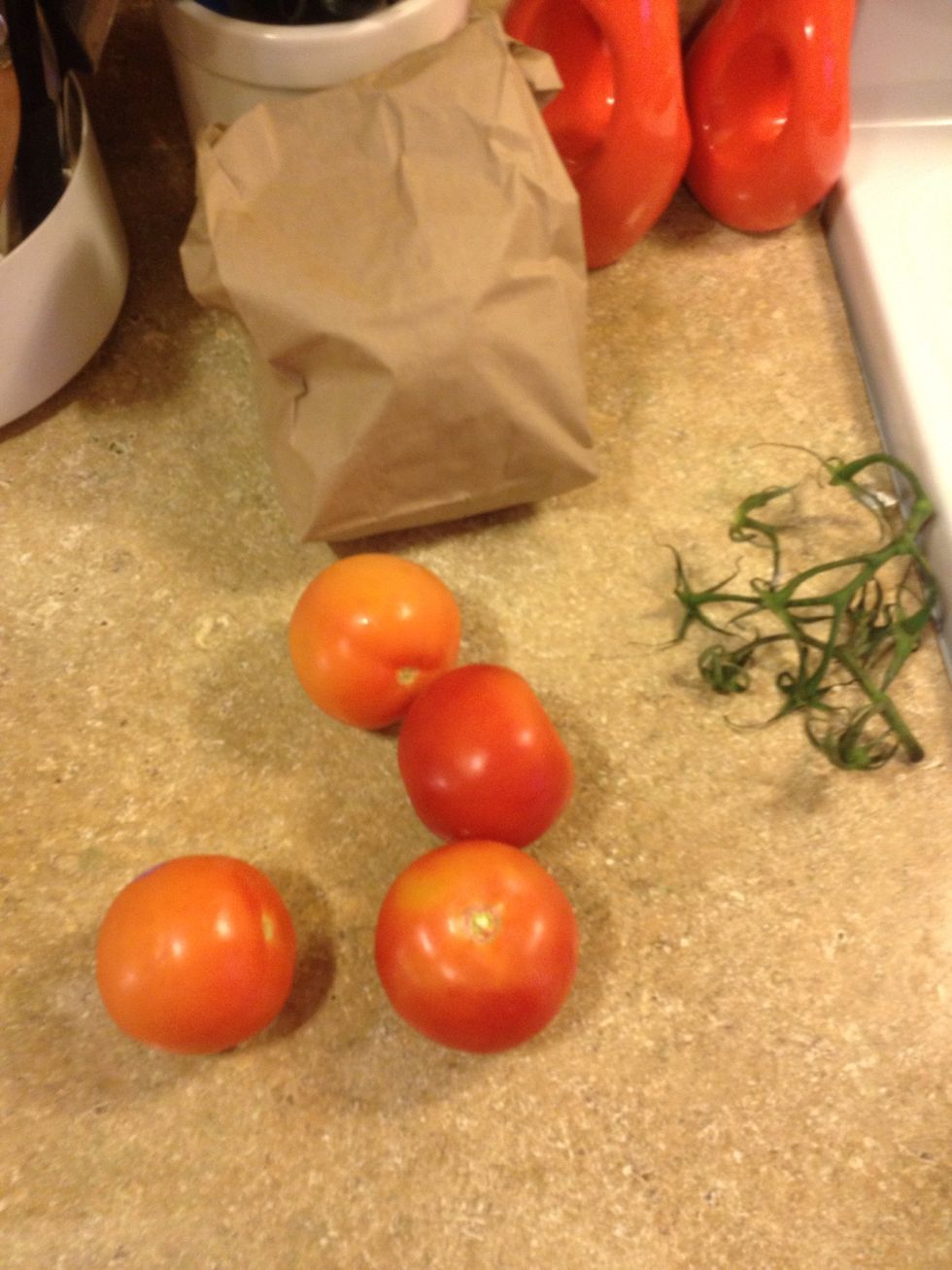 Tomatoes and mushrooms don't get sliced, just remove from steams and place in a brown paper bag