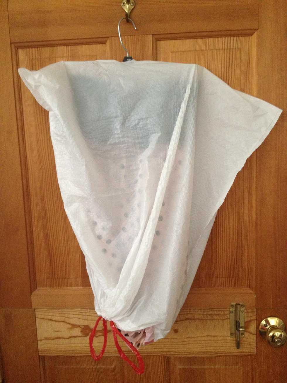 Place the garbage bag over dress. Keep the dress on the hanger