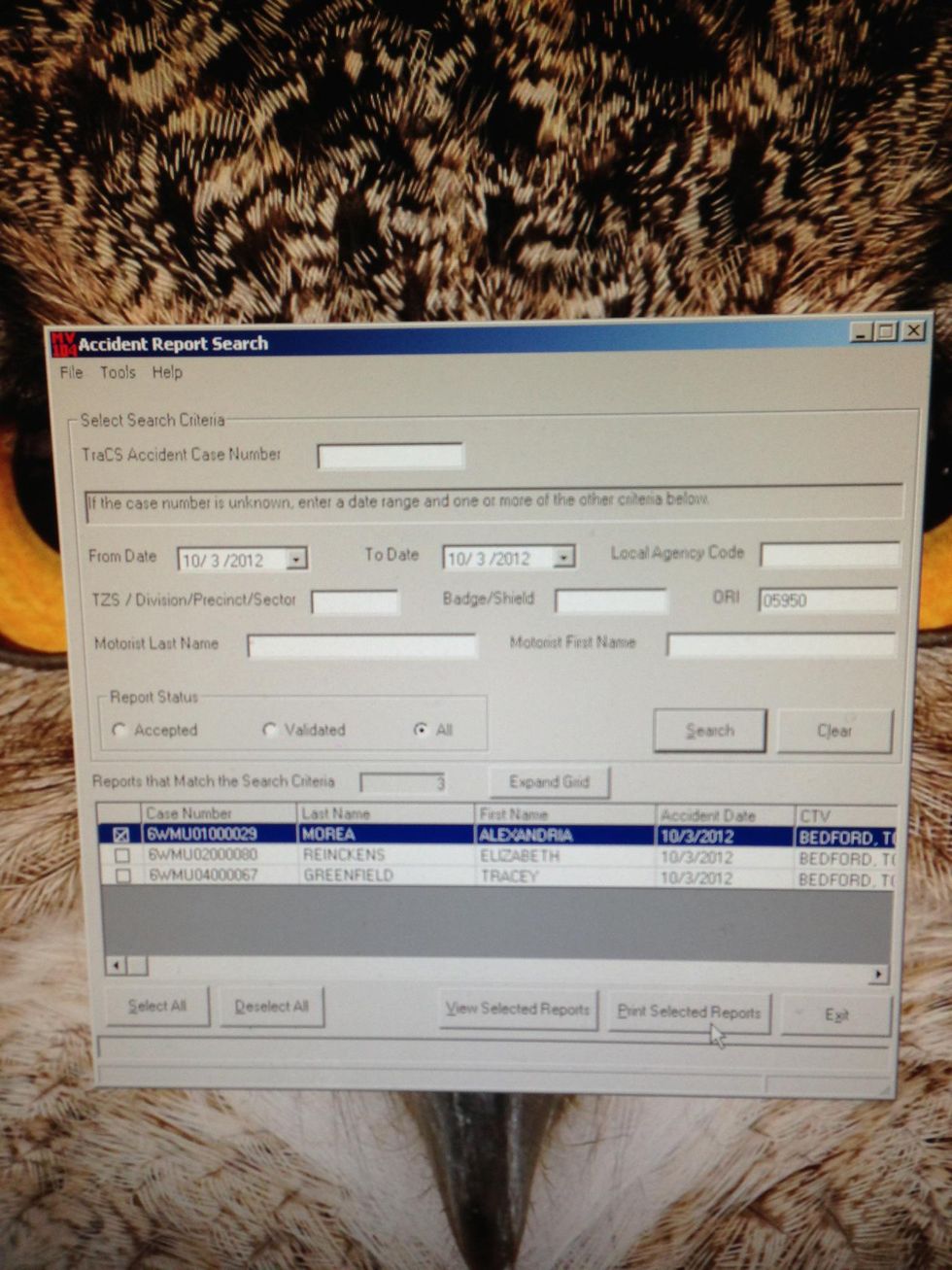 Open MV104 Print ProgramChoose date or date rangeMake sure ORI field is filled with 05950Ensure report status is AllClick SeachDouble click report wanted.Click view or print selected reports.