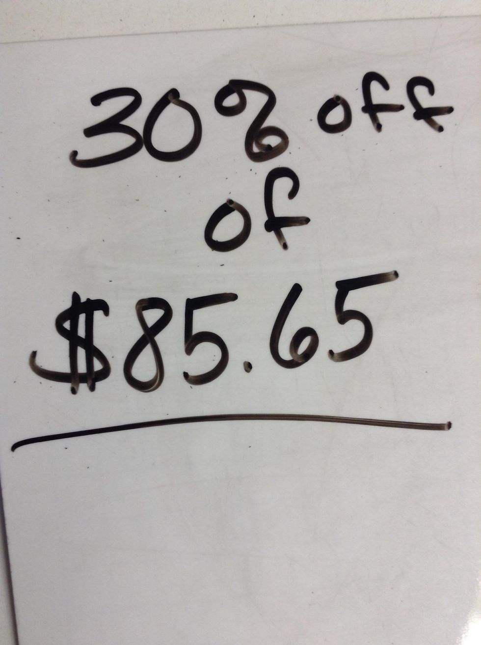The problem is- the original cost for a pair of boots was $85.65 but you have a coupon for 30% off. What will you owe the cashier?