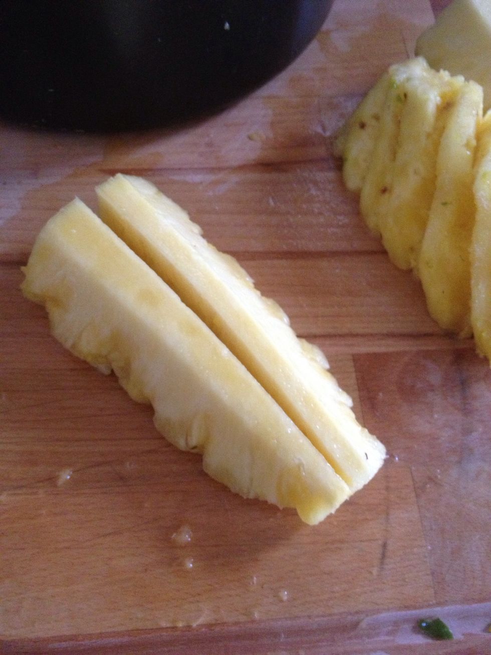 Quarter the pineapple through the center core. Place the quarter on its side (as pictured) and cut the core out at a 45• angle.
