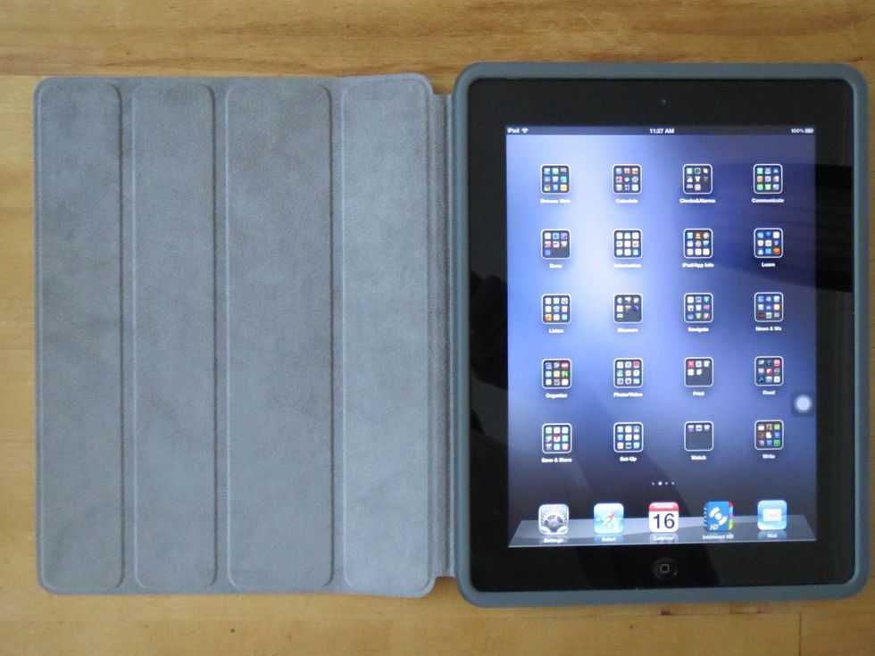 iPad in the Smart Case. The case has a smooth exterior but still has a bit of grip to it so you don't feel like it will slip out of your hand. The microfiber interior helps keep the screen clean.