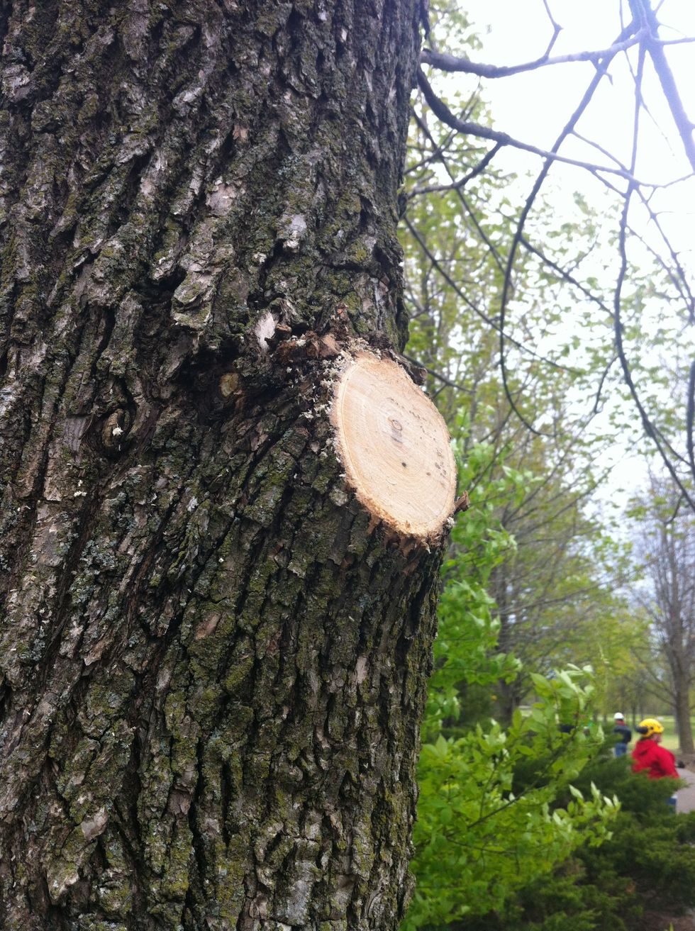 Create a cut on the underside of the branch approximately 12" away from the trunk. Saw about 1/3 of the way through the branch.