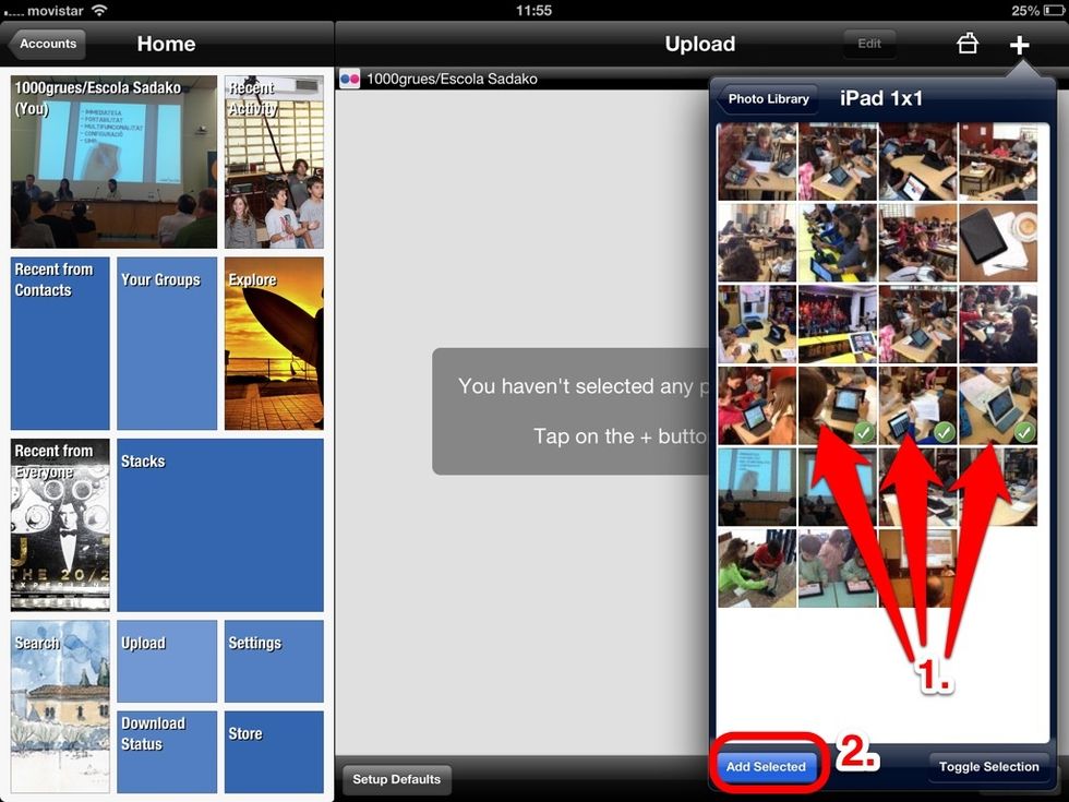 1. Seleccioneu fent "tap" a cada imatge que voleu pujar a Flickr. 2. Feu "tap" a "Done"