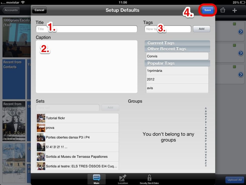 Si voleu afegir etiquetes a l'àlbum, feu "tap" a "+Tags". Afegir etiquetes (curs12/13, 3rprimària, excursió...) facilitarà una recerca futura de l'arxiu fotogràfic.