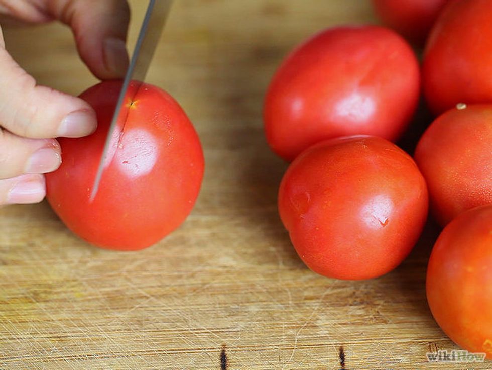 Then begin to peel the tomato skins off to put into food processor, then doth forget to discard your skins.