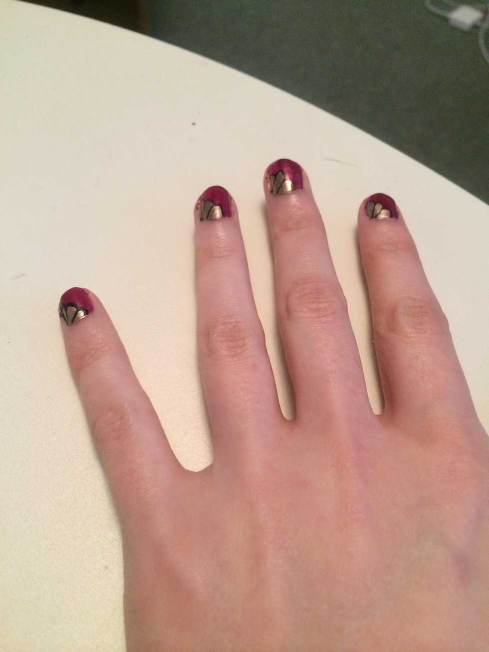 I then painted gold nail varnish on the left side, the bottom and then the middle part in between the two strokes on my nail.
