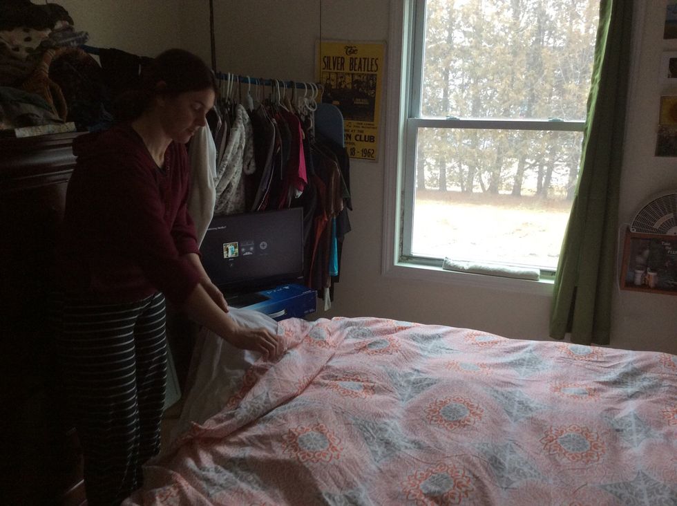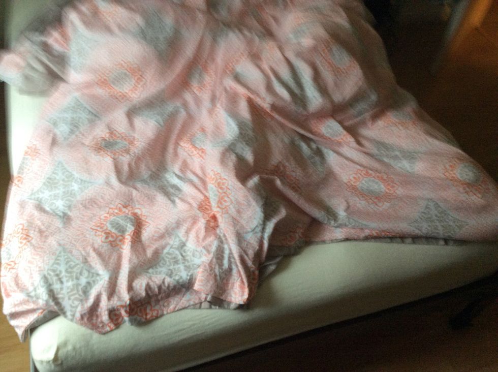 Here I take the blanket that will go into the duvet cover and folded it in half towards the bottom of the bed