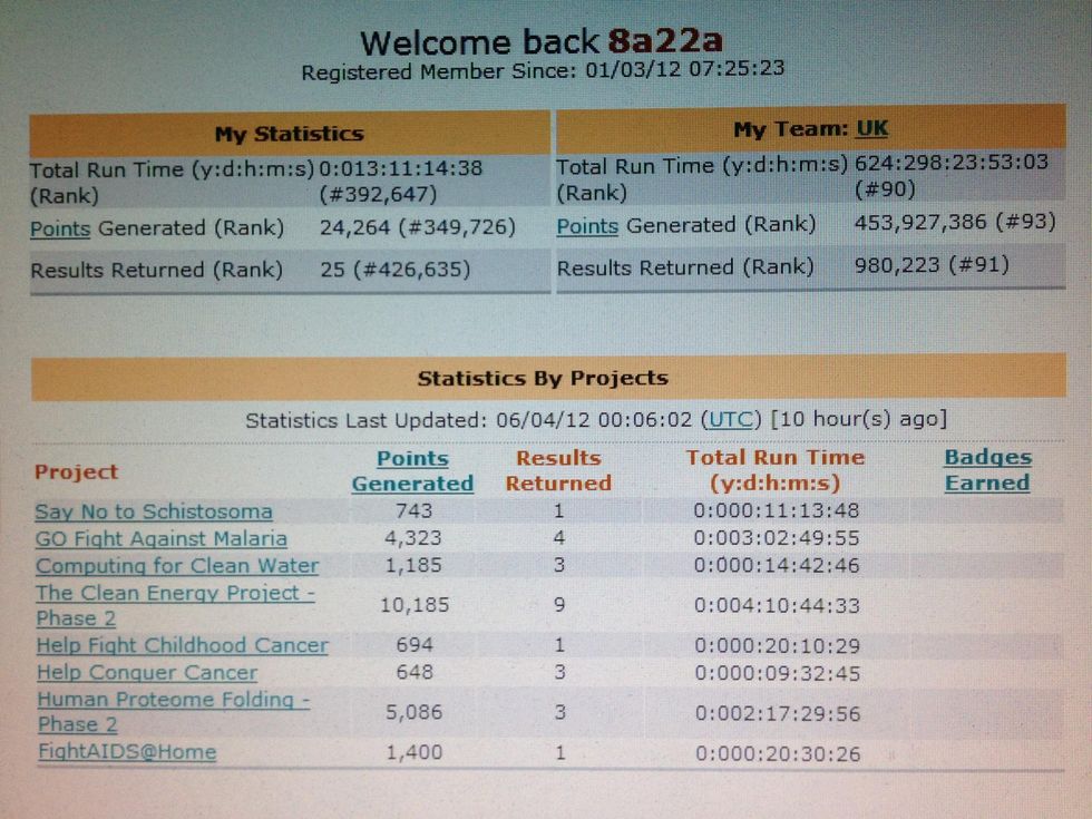 Compete with Friends to see who can get the most points and processor time. Amazingly WCG's total run time so far is 585,815 years.
