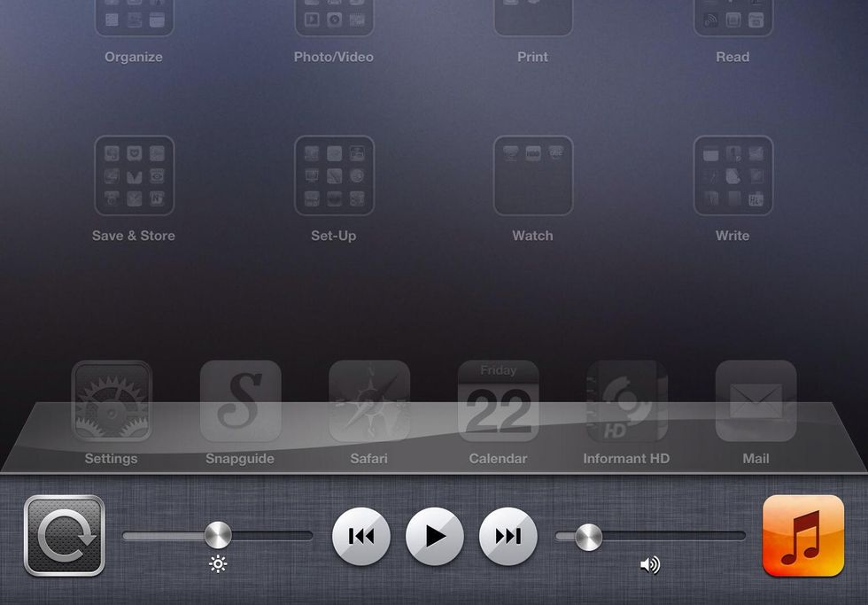 A group of frequently used controls is revealed for quick access to lock rotation, adjust brightness & volume and a few other controls as well. Touch anywhere above the bar to return.