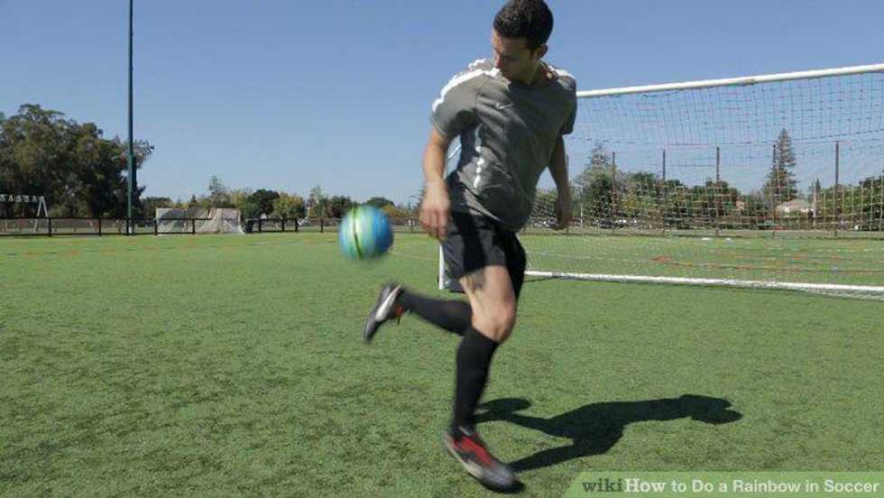 Put ball in Between feetUse your dominant foot to sweep ball up opposite leg Use a motion to cause the ball to roll off your leg at the knee and drop down toward the heel. Lean forward and Kick ball up with heel