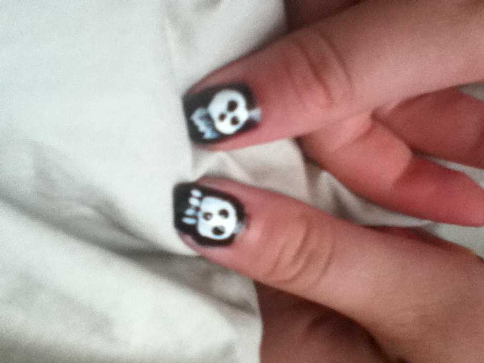 Paint 2 coats of black on ur thumbs.Paint a white circle...Add 4 or more teeth.Add 3 dots.Color Ur Fingers with red, yellow, green, and blue!!Don't forget to add ur top coat!!!My Thumbs😍💀