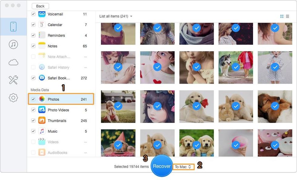 Step 2. All your data including the deleted ones will display after scanning. Choose the deleted files you want to retrieve > set To Device directly or To Mac/PC > click Recover button to start.