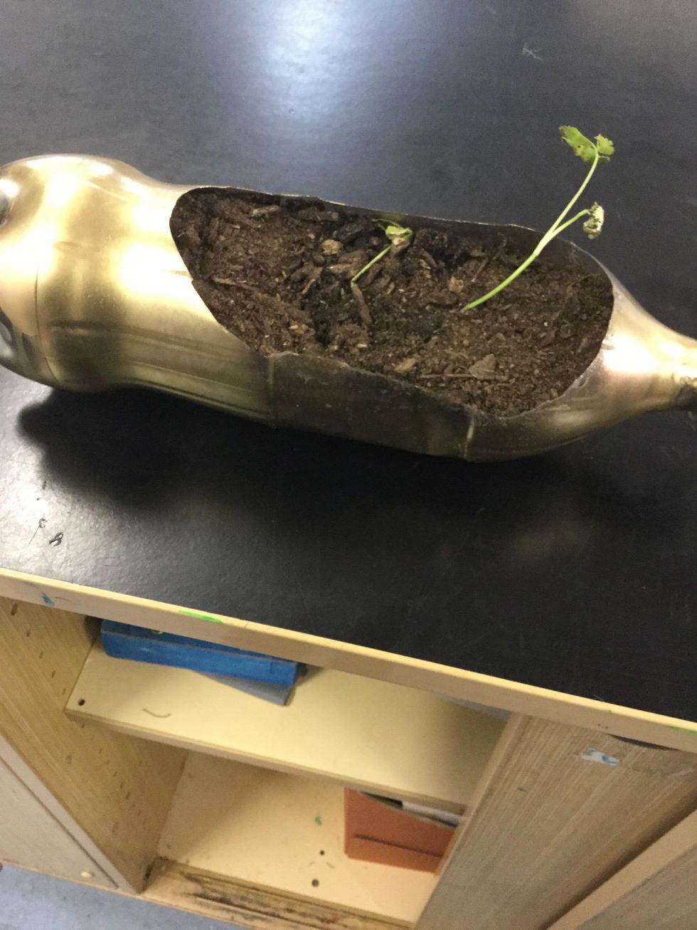 Get your spray paint and spray the bottle before your put the plant in and then once your done spray painting the bottle you can plant the plant / seed and the water it to keep it healthy
