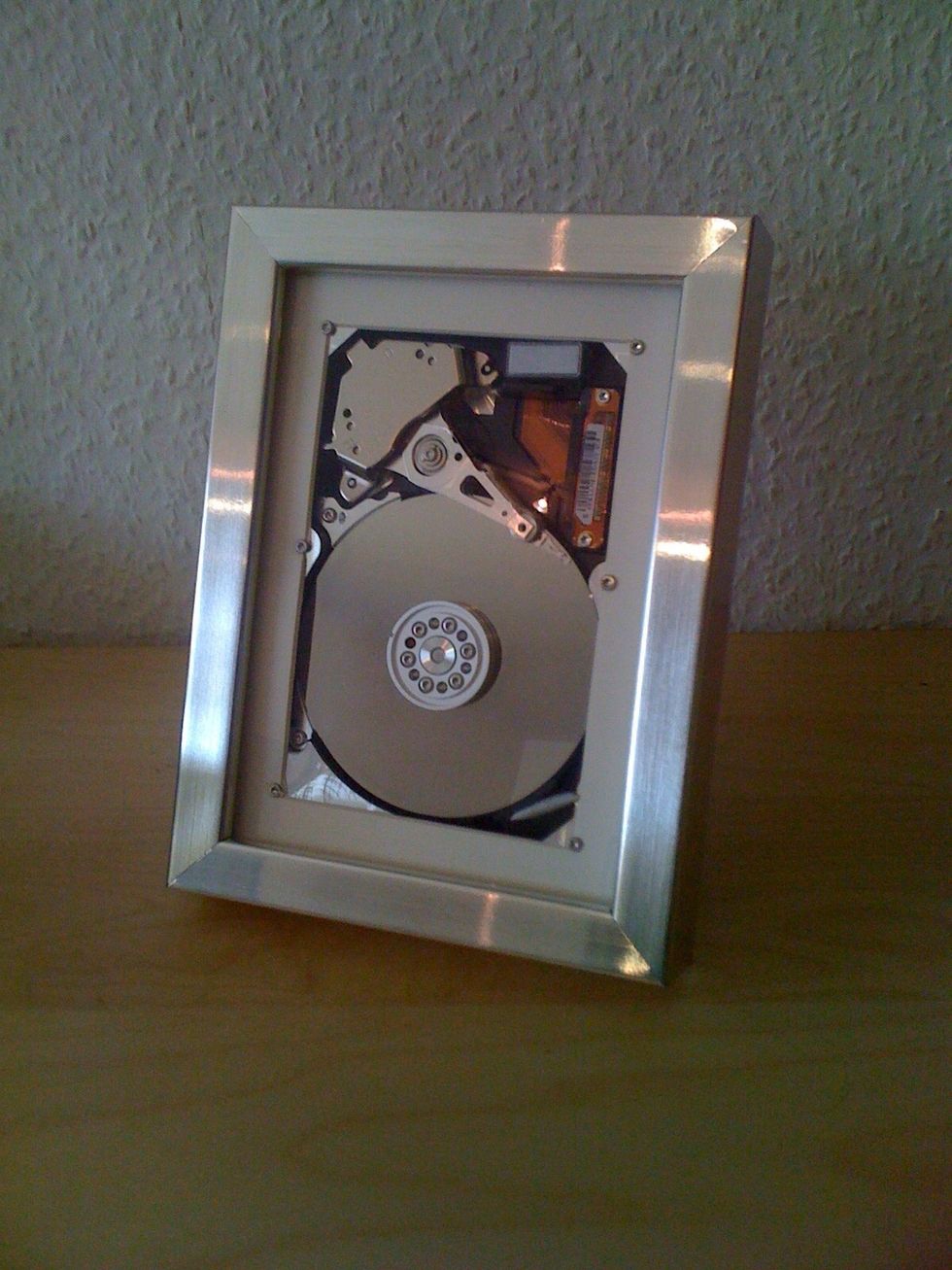 Go get a picture frame - I recommend Ribba from IKEa. It has the perfect fit for 3.5" harddrives