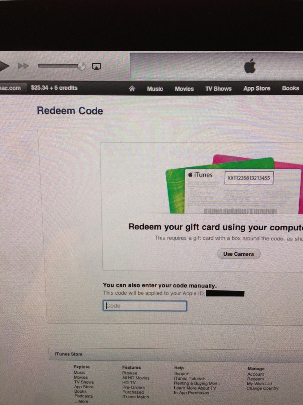 Scratch or peel off the hidden code on the back of the iTunes Gift card. Enter that code in the box shown.