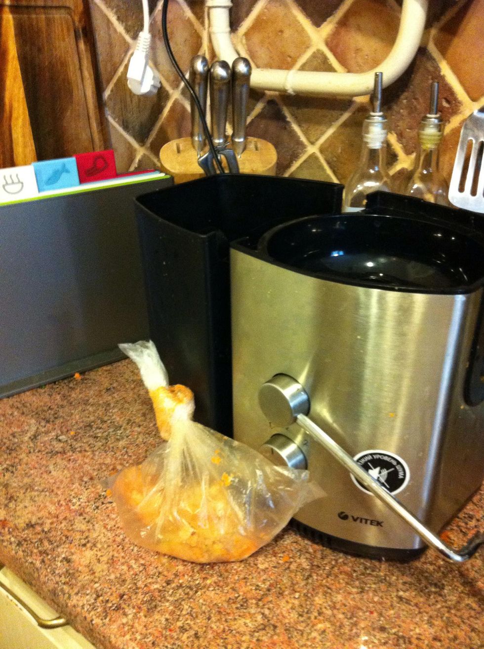 When reassembled you can see that all the waste is thrown away into the plastic bag. You can clean the other parts of the juicer with hands putting the pulp which has stuck onto them inside the bag.