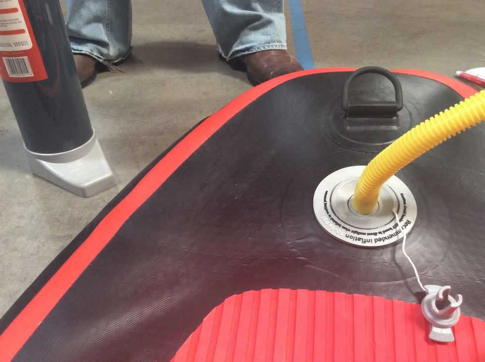Make sure the red nipple is in the up position. This closes the valve so you can now pump up your board. To close, depress and turn the nipple a quarter turn in either direction until it pops up.
