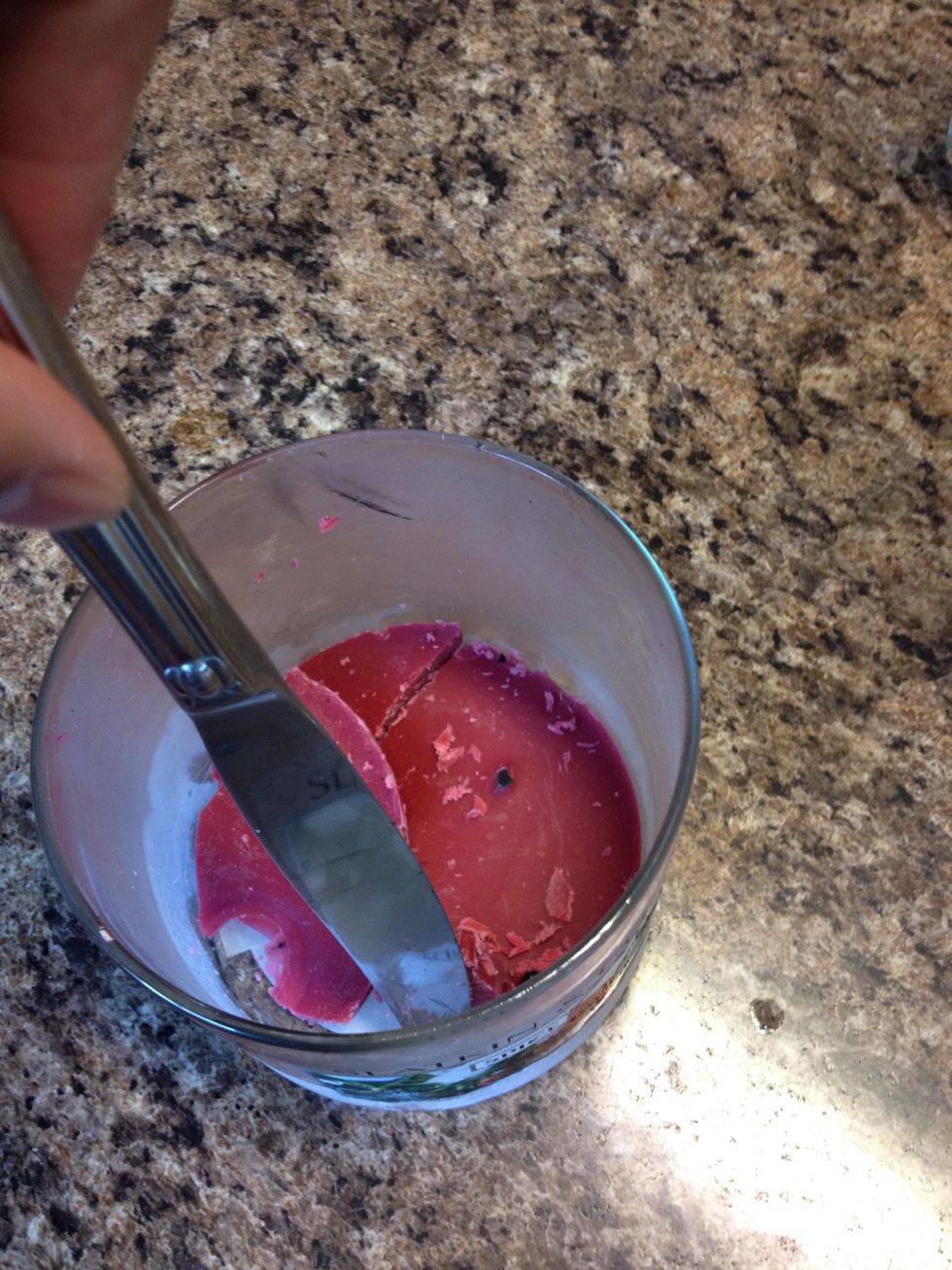 Once you're done with the candle jar, it'll have a little bit of candle left. Put the jar inside your freezer. Let it sit for at least an hour. I had forgotten about mine and left it in for days!