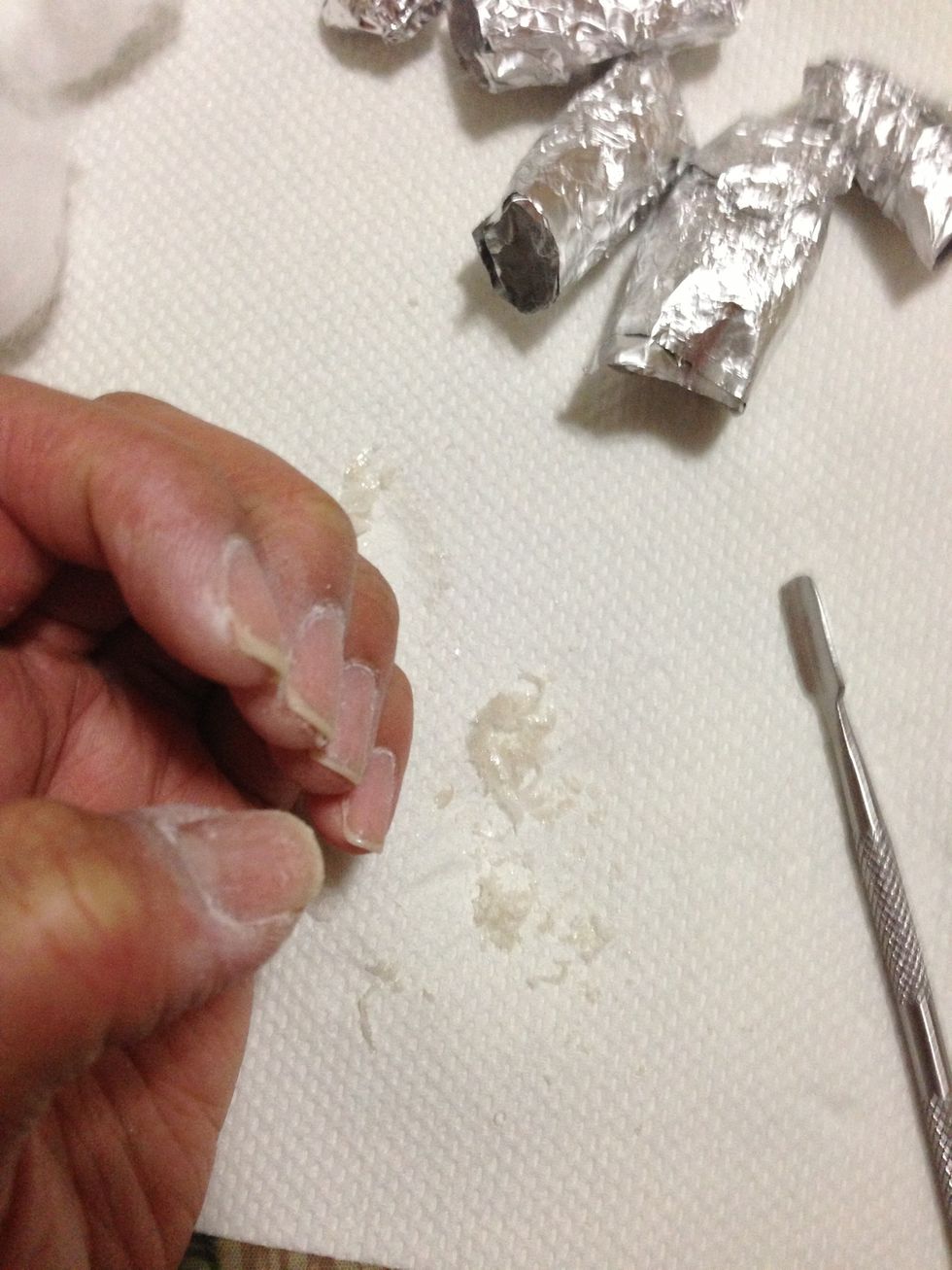 let it stand for about 10 minutes. This will make the polish soft. Easy to push with the nail pusher.