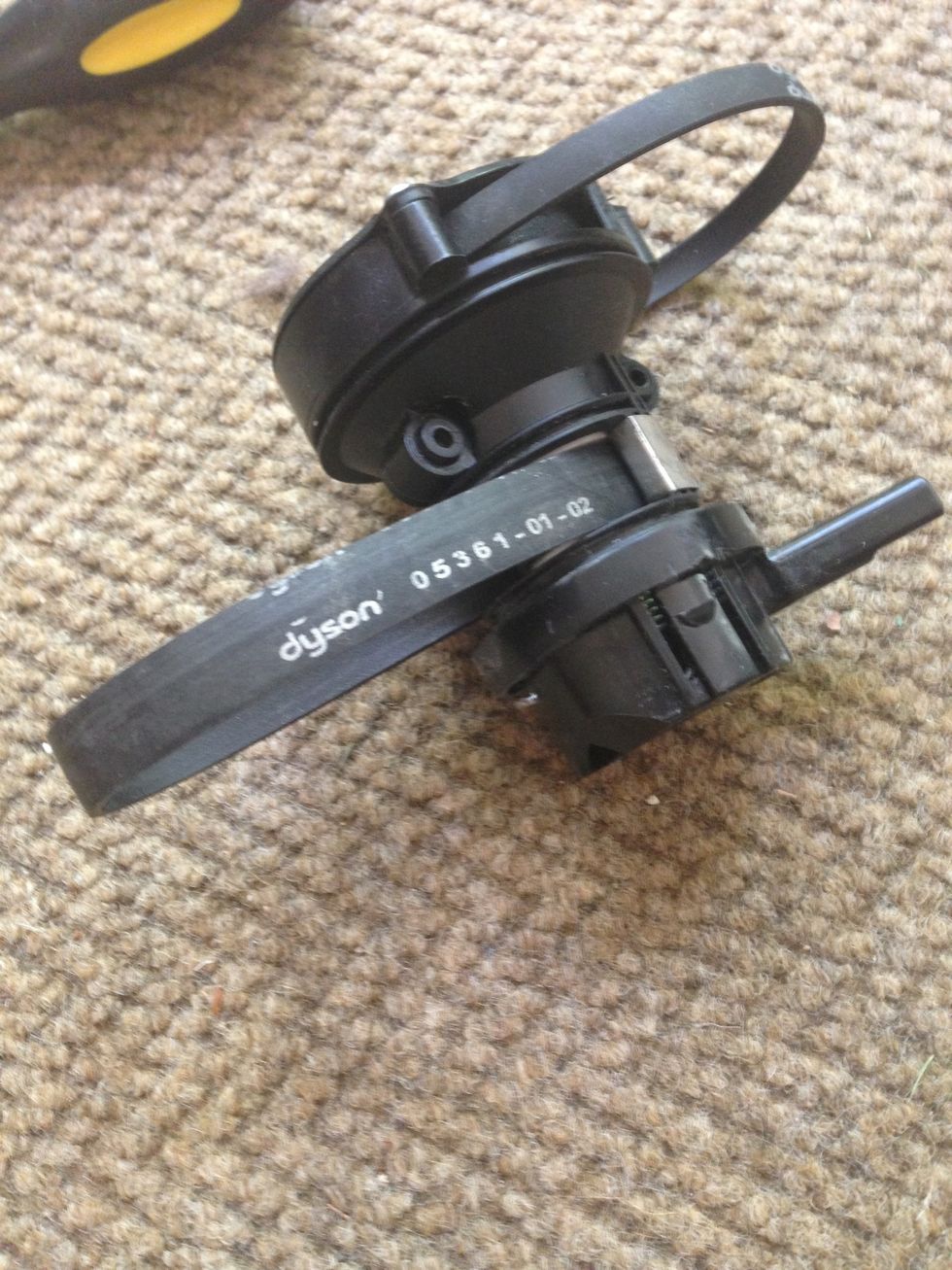 Now you've exposed the clutch. First with a screwdriver slide the main belt off the motor shaft. . Then to remove the clutch it is grab both belts, one in each hand, and pull