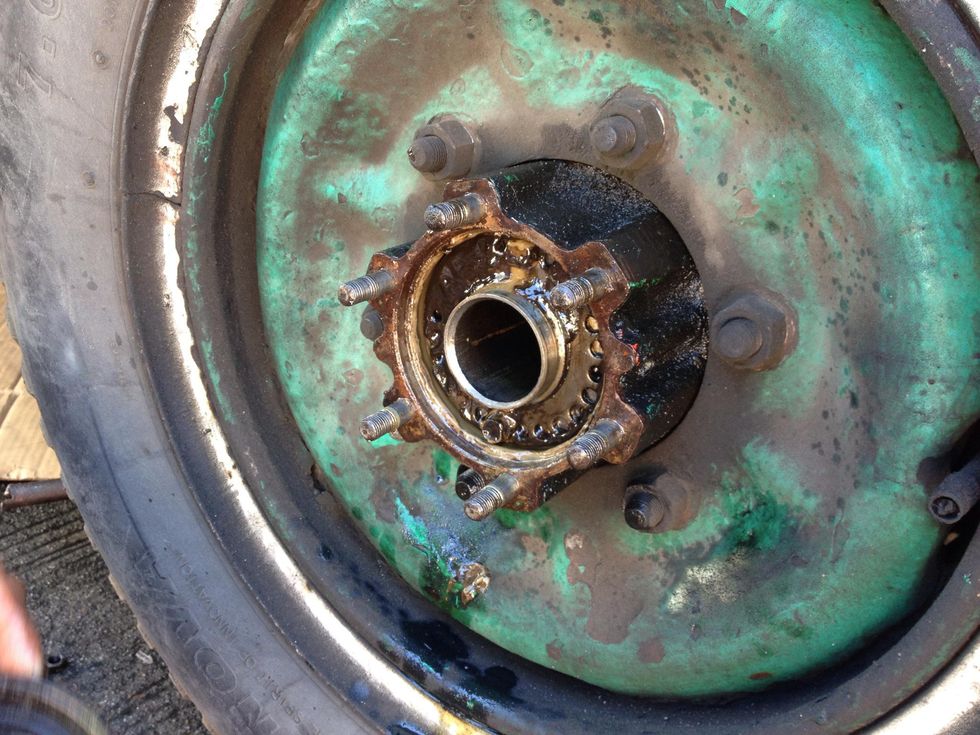 Locate the tire with oil leak problem. You should see some oil leaks from the center.