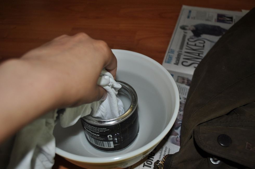 Rub the wax into the jacket in a circular motion. Be thorough and ensure there is no excess wax left on the surface. You will see the jacket darken and appear oily where you applied wax.