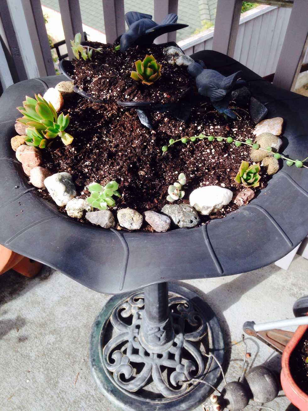 Fill bird bath with potting soil. Normally I would first add a layer of gravel, for water drainage, but since this is shallow, I didn't, as the soil will dry out before any root rot would set in.