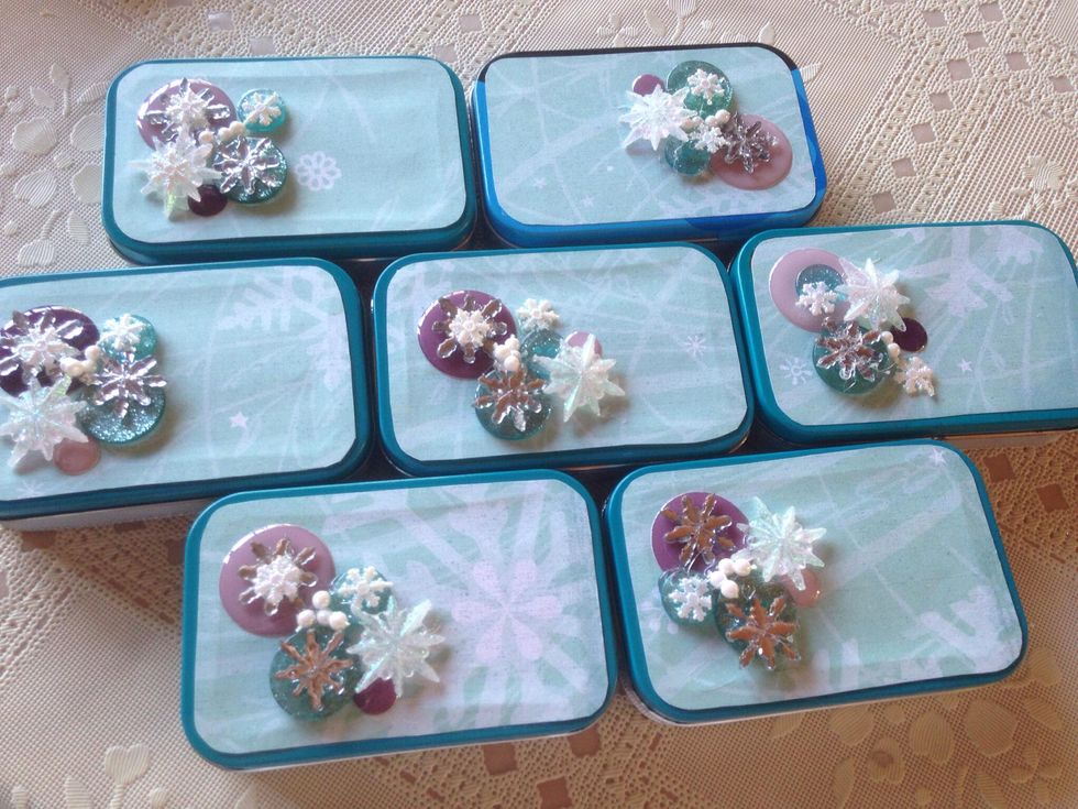 Use adhesive to attach cut-to-size papers to top and bottom of tin.