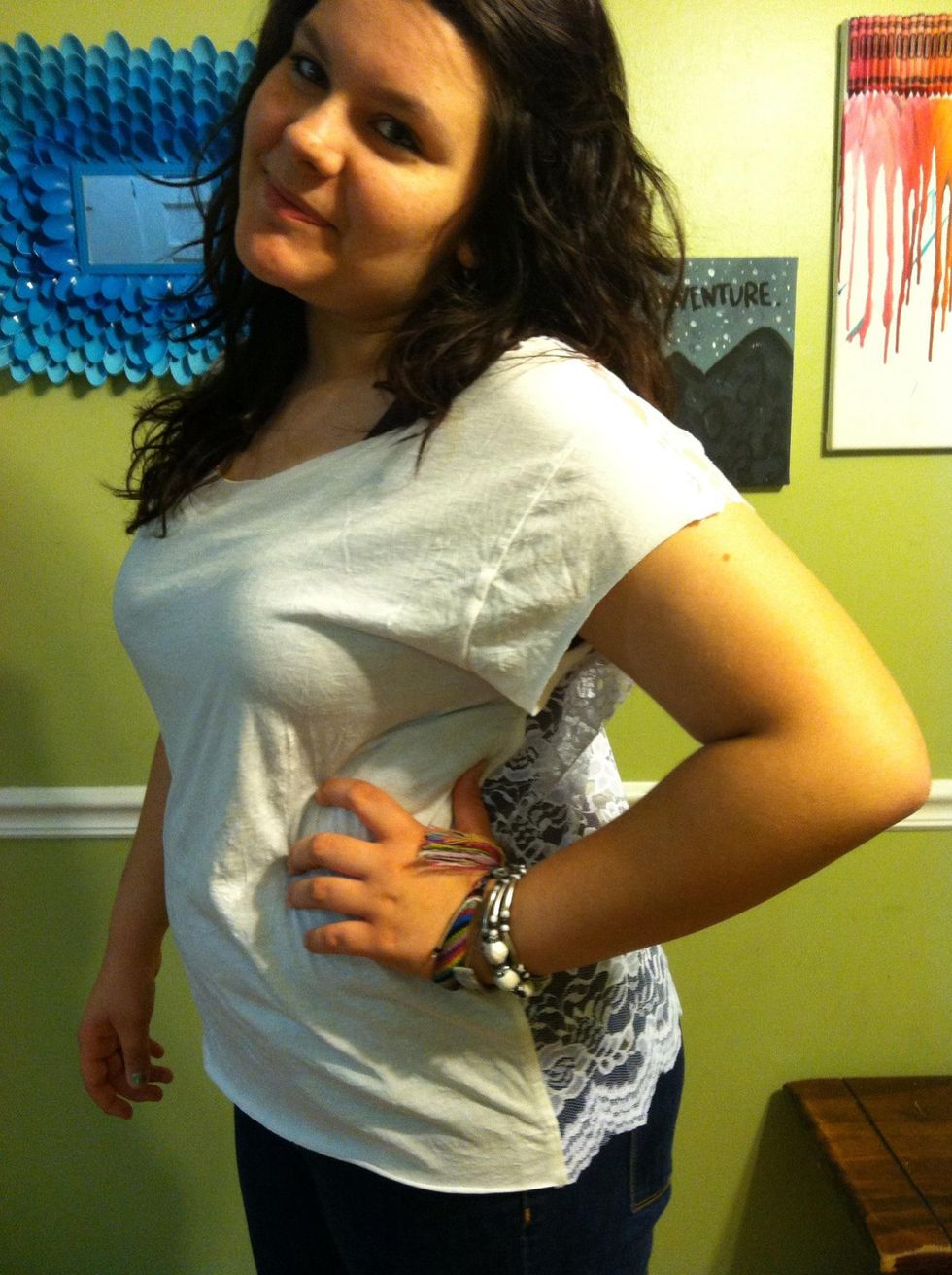 The lace was a table cloth I got at Goodwill for $1.99. There was enough left over for 5 more shirts!