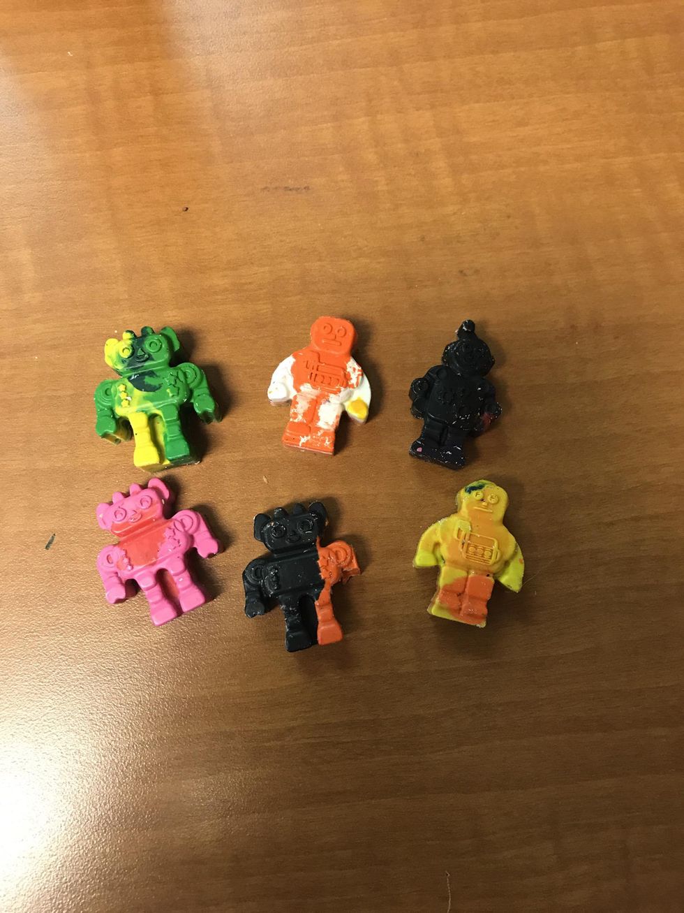 Break the crayons into small pieces and divide them into the molds. Cover a baking sheet in aluminum foil and place the mold on the sheet. Bake at 250 for 20 minutes or until the crayons have melted.