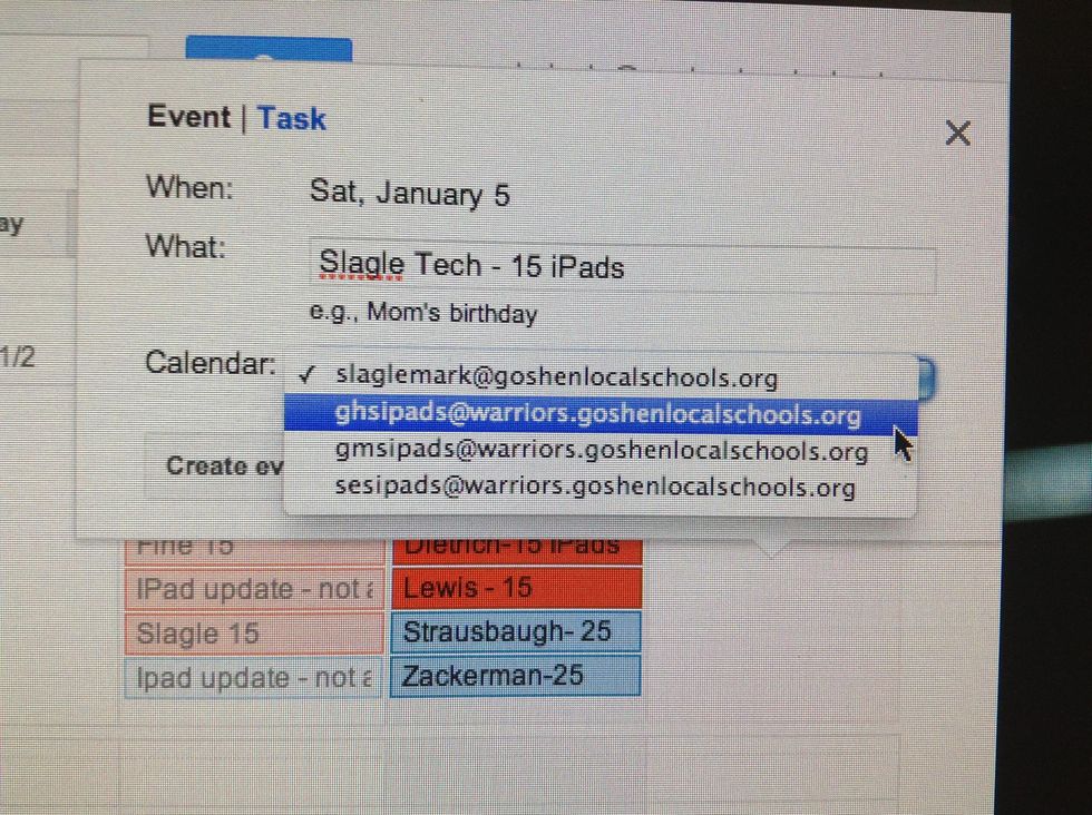 Click a day, enter your name and number of iPads. CRITICAL: You MUST choose the correct calendar, or no one but you will know you've reserved iPads! Click Create event to reserve your iPads.