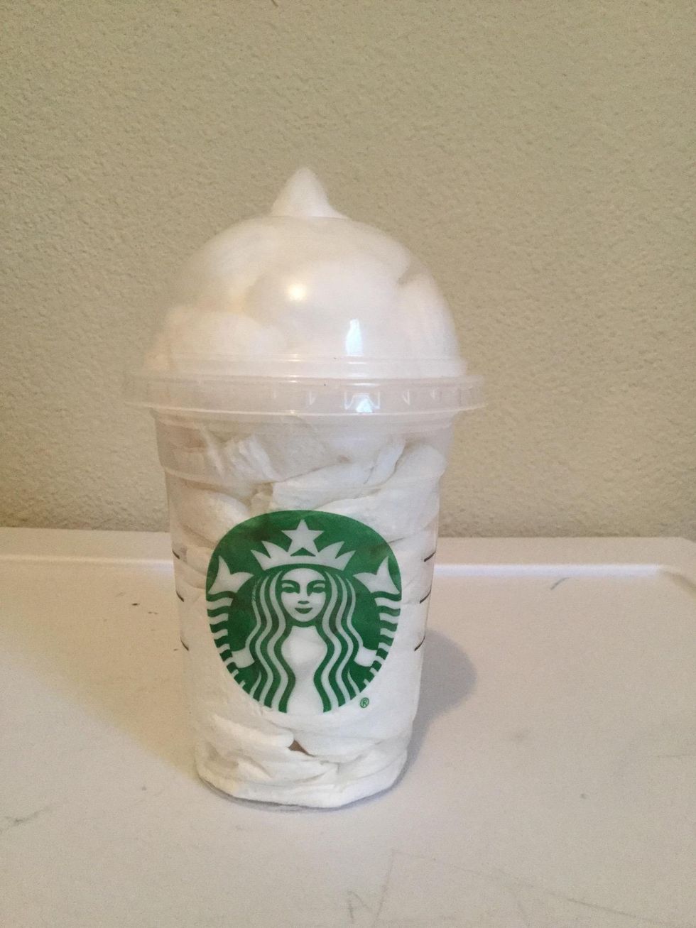 This is what you need!Ok stuff it with at least 15 napkins or more.Add cotton balls as the whooped cream an voilà a fake vanilla frappuccino!!!!