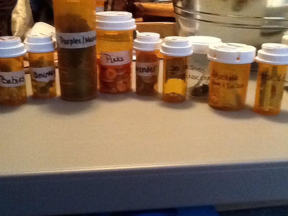The bottles are a great way to sort craft and sewing notions AND keep the ones you are currently working with easily accessible to YOU while still safe from the mouths of small children!