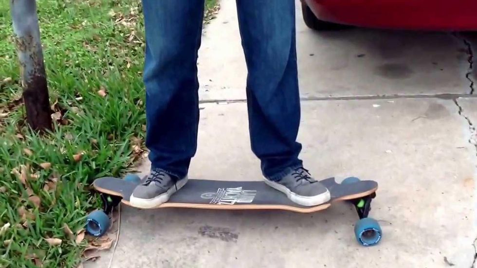 Once you have taken a few pushes and gotten to the speed you feel comfortable at, you should angle your feet like this. To turn you just want to lean your feet the direction you want to turn.
