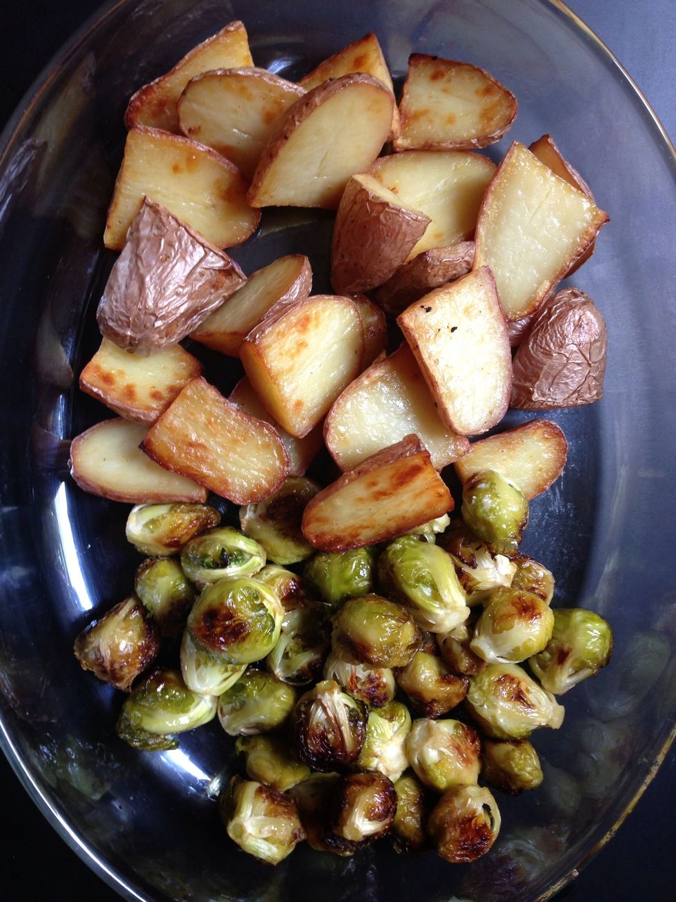 Put both trays in a cold oven. Potatoes up Brussels sprouts under. Brussels sprouts cook faster. Here I made a mistake for the picture but I exchanged up down while cooking. Put on oven on bake 180C