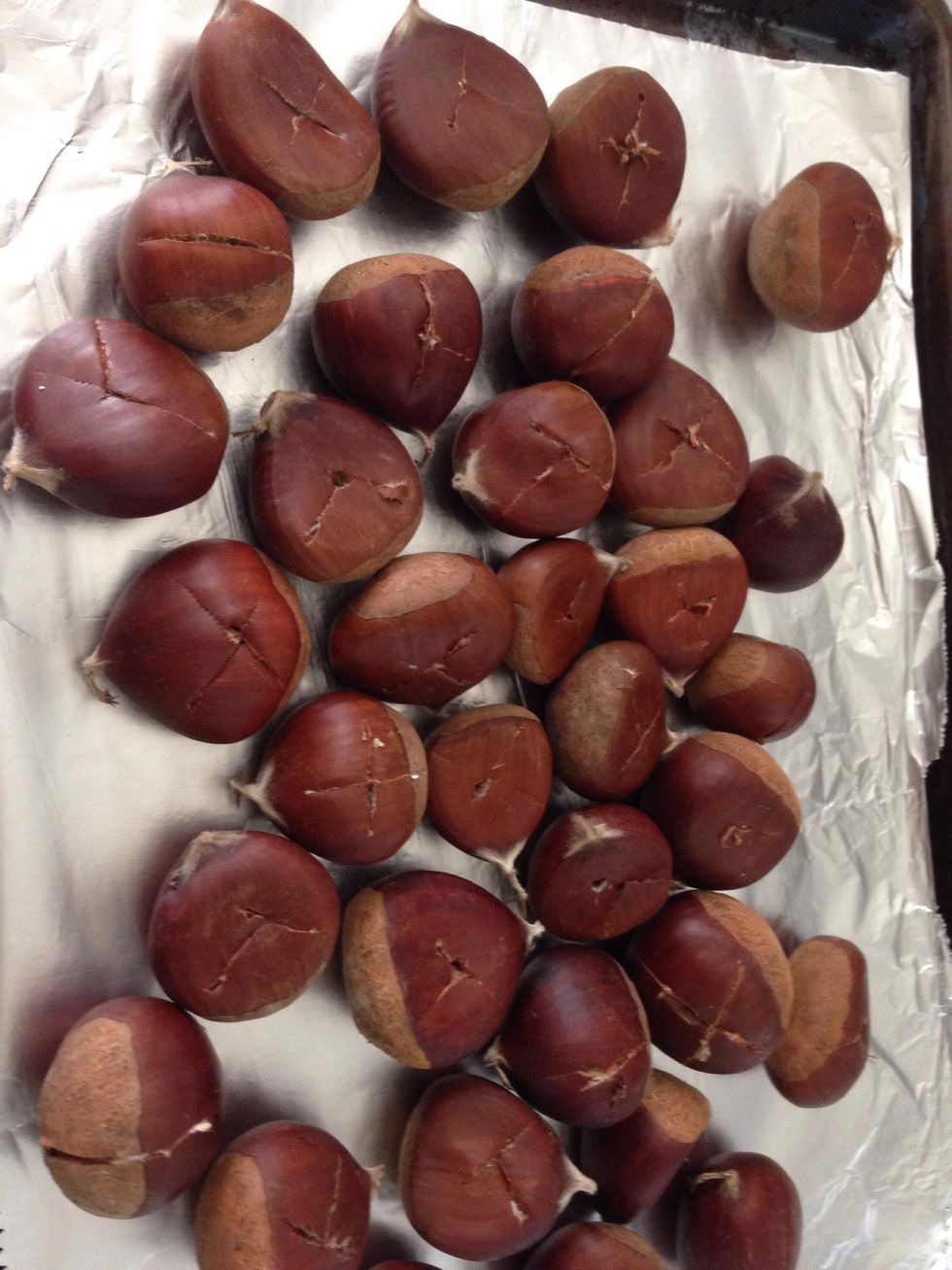 cut a "X" on the flat side of each chestnut while the oven heats.